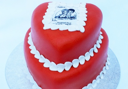 Uniek bij Smulfun is deze 2 laags stapeltaart van 2 liefdeshartjes. Deze 2 laags stapeltaart is voor 16 personen en kan geleverd worden met een leuke "Liefde is" spreuk.