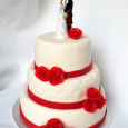 Deze traditionele bruidstaart wordt opgebouwd met een verzorgde basis van marsepein en fondant in een lichte ivoortint. Voor een bruidstaart in Oosterhout zorgt dat voor een rustige, elegante uitstraling, terwijl rode rozen en een bijpassend lint juist net genoeg contrast geven om het ontwerp levendig en feestelijk te maken. Zo blijft de taart stijlvol, klassiek en duidelijk herkenbaar als middelpunt van de tafel.