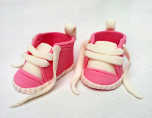 Leuke roze baby sneakers gemaakt van witte en roze fondant. De babyschoentjes zijn helemaal met de hand gemaakt en diende als decoratie voor een hippe babyshower. Op de babyshower werd ook gesmuld van lekkere baby-girl cupcakes en een gepimpte zwangerebuiktaart.