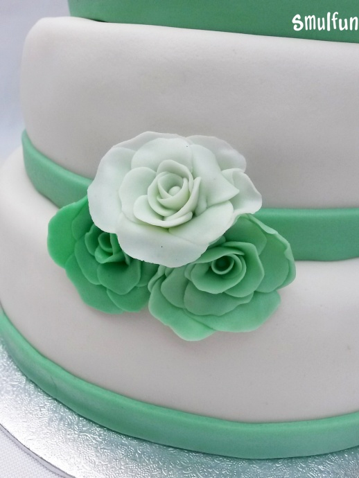 Bruidstaart met handgemaakte rozen in 3 verschillende tinten mint groen.