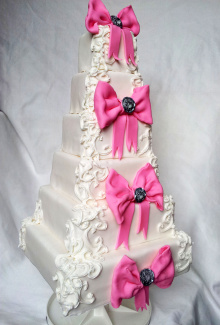 De zichtbare Smulfun-pagina beschrijft deze taart als een spierwitte bruidstaart uit zes lagen, versierd met Royal icing en mooie roze strikken. Voor een bruidstaart in Breda geeft dat een verfijnd en feestelijk totaalbeeld, waarbij hoogte, decoratie en kleur mooi samenwerken om een echte blikvanger op de bruidstafel te vormen.