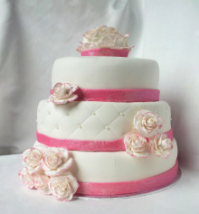 Mooie 3-laags stapeltaart met roze linten en leuke rozen. De rozen hebben een mooi roze glitterrandje en als taartopper is niet voor een bruidspaar, maar voor een grote eetbare roos gekozen. De linten hebben een mooi glitter accent en geven de taart een echte finishing touch.