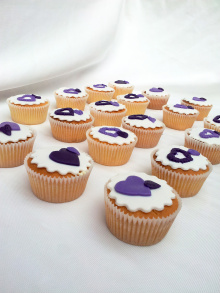 Met deze leuke cupcakes op je bruiloft is er voor ieder wat wils. Deze bruidscupcakes zijn met leuke paarse hartjes versierd en passen bij de bruidstaart. Heerlijke cakejes voor de kinderen!