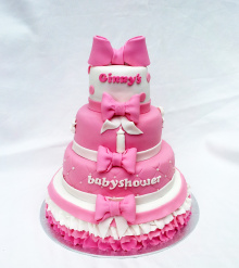 Leuke 4 laags stapeltaart voor op zoetetafel voor de babyshower. De babyshower is als verassing georganiseerd en deze babyshower taart samen met leuke baby-girl cupcakes maken het feest helemaal compleet!
