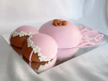 Zwangerebuiktaart aangekleed met een leuk roze jurkje en versierd met bloemetjes en baby voetjes. De zwangerebuiktaart is een ware traktatie voor de geboorte van uw kind!