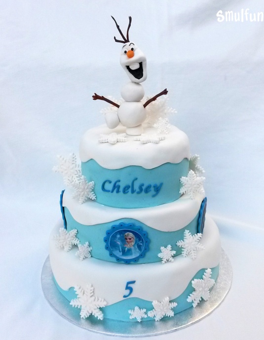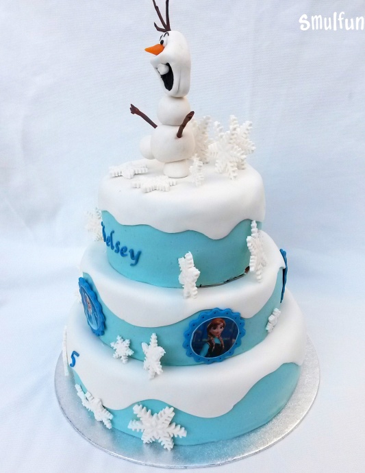 3-laags stapeltaart van Frozen bekleed met ijsblauwe marsepein en sneeuwwitte fondant. De Frozen stapeltaart heeft een origineel met de hand gemaakte Olaf als boetseersel en aan de zijkant zijn alle personages van Frozen als eetbare print in een leuk blauw lijstje geplaatst. De Frozen taart is helemaal in winterstijl versierd met ijssterren en sneeuw. Met deze Frozen taart kan het verjaardagsfeest niet meer stuk. Dat wordt Smullen!