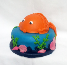 Leuke stapeltaart met boltaartje versierd als goudvis boven op de taart. De taart is bekleed in zee-blauwe marsepein en fondant en geheel in onderwaterstijl versierd. Een ware traktatie voor de verjaardag.