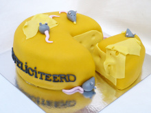Leuke gele kaastaart gemaakt van lekkere cake gevuld met heerlijke botercrème en bekleed met gele kaaskleurige marsepein. De kaas is al aangesneden en de muizen vinden hem heerlijk... Wie heeft mijn kaas gepikt? Laten we muizen gaan vangen!