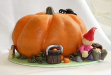 Leuke pompoentaart die met de hand uit een lekker stuk biscuit cake gesneden is en bekleed met lekkere pompoenkleurige marsepein. Het kaboutertje is geboetseerd van marsepein en alle delen zijn eetbaar. Een ware traktatie voor een speciale gelegenheid. Zo kunt u ook een pompoentaart bestellen voor Halloween. Deze zijn schikbarend lekker!