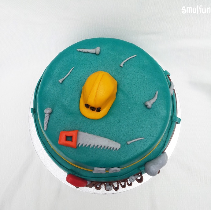 Leuke Abraham taart voor de 50 ste verjaardag. De taart is gevuld met een lekkere aardbeien slagroom vulling en bekleed met turquoise marsefont (marsepein en fondant). Met de leuke bouwhelm en gereedschapsriem als decoraties kom de taart helemaal tot zijn recht.