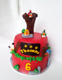 Stoere rode stapeltaart met boze vogels en geheel in Angry Birds stijl versierd. Voor de zesde verjaardag wilde Thomas een Angry Birds taart. Alle vogels van het spel moesten er natuurlijk op. Het naambordje maakt de taart helemaal af. Laat het feest maar beginnen!