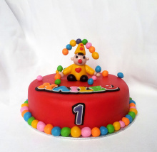 Leuke Bumba taart van het Bumba circus. De verjaardagstaart is gemaakt van lekkere biscuitcake gevuld met heerlijke aardbeien vulling en bekleed met rode marsepein. Bumba is geboetseerd van marsepein en de circustruc maakt de taart helemaal af!