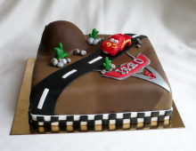 Leuke vierkante cars-taart voor de verjaardag van Jaro. De carstaart is bekleed met lekkere chocolade marsepein en helemaal in stijl aangekleed. Een echte traktatie
