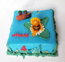 Leuke Maya de Bij taart met leuke versieringen en boetseersels. Deze verjaardagstaart is weer echt helemaal hip sinds Maya de Bij weer terug op de buis is.