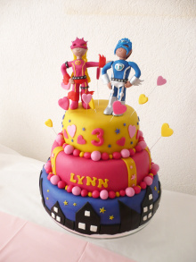 Leuke stapeltaart met Mega Mindy en Mega Toby. De taart is versierd met vrolijke knalkleuren en de poppetjes zijn met de hand geboetseerd van marsepein. Samen met de leuke versiering en de stads achtergrond met huisjes en leuke sterretjes en vliegende hartjes is deze taart een echte gangmaker voor het verjaardagsfeest!