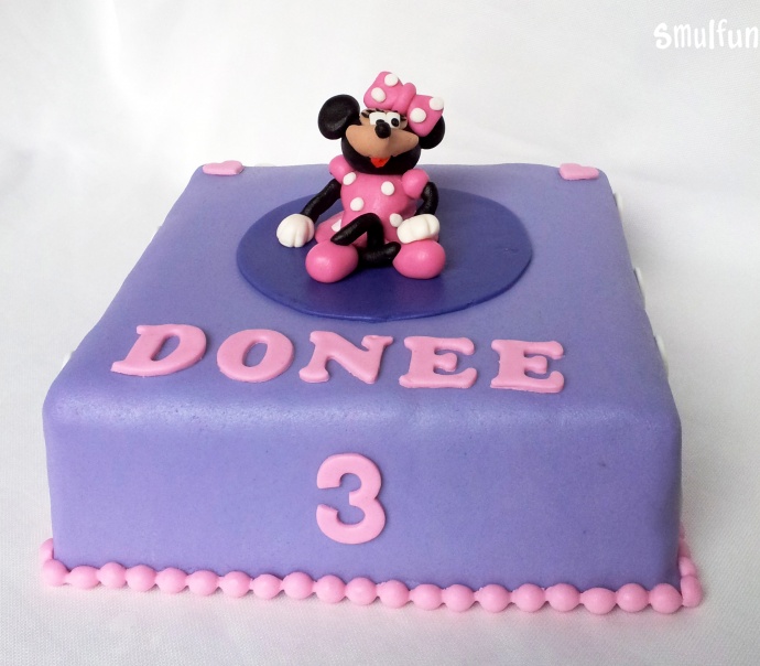 Leuke vierkante Minnie Mouse taart met paarse en roze marsepein, fondant en leuke witte stippen. Minnie Mouse zit boven op de verjaardagstaart en is geboetseerd van marsepein. Wat een heerlijke traktatie!