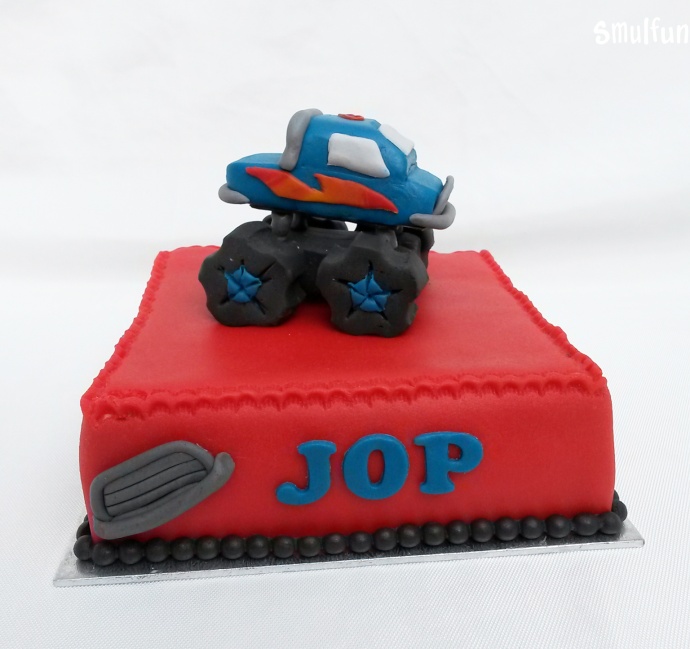 Leuke Monstertrucks taart met een stoere blauwe truck met rode vlammen. De vierkante taart is gevuld met een lekkere aardbeien slagroom vulling en bekleed met rode marsepein. Met deze Monstertruck taart kan het verjaardagsfeest niet meer stuk!