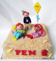 Leuke taart van het Zandkasteel aan zee. De taart is gevuld met lekkere aardbeien-slagroom vulling en bekleed met lekkere marsepein. Het strand is gemaakt van koekkruimels en Sassa, Toto en Koning Koos zijn met hand geboetseerd van marsepein. Echt een leuke taart om de verjaardag te vieren. Dat wordt Smullen!