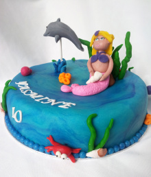 Mooie zeemeerminnen taart met aquablauw bekleedde laag marsepein en versierd met leuke zee decoraties. De zeemeermin en dolfijn zijn met de hand geboetseerd van marsepein. Hierdoor komt de verjaardagstaart echt tot leven. Een echte smultaart!