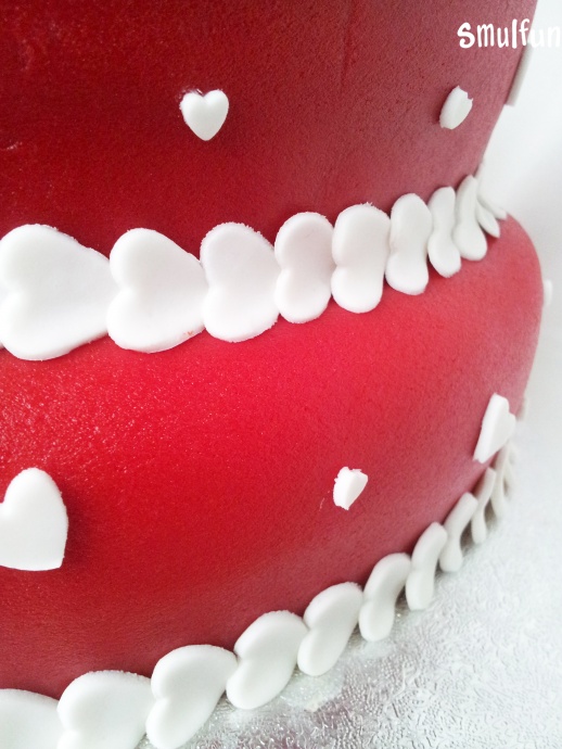 Mooi hartvormige stapeltaart opgebouwd uit 2 lagen. Deze verjaardagstaart is bekleed met lekkere rode marsepein en versierd met witte hartjes en een leuk kroontje boven op de taart.