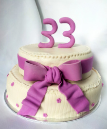 Leuke ivoor kleurige stapeltaart met paarse strik met lint. Bovenop de taart is het cijfer 33 met de hand geboetseerd. Een echte Smultaart voor een gezellig verjaardagsfeest - Dat wordt smullen!
