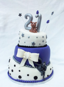 Mooie 3-laags Topsy Turvy stapeltaart met witte en paarse marsepein en fondant bekleed en versierd met zilver en zwarte decoraties. Wens was om een mooie poezen taart te maken. De taart heeft 2 geboetseerde poezen gekregen en is een echte knal verjaardagstaart!