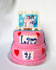 Leuke K3 stapeltaart opgebouwd uit 2 heerlijke lagen cake. De taart is bekleed met lekkere roze marsepein en versierd met roze hartjes. Boven op de taart is een eetbare print van Josje, Karen en Kristel in een mooi lijstje van fondant geplaatst en met een leuke regenboog versierd. Dat ziet er feestelijk uit, Laat die fuif maar beginnen!