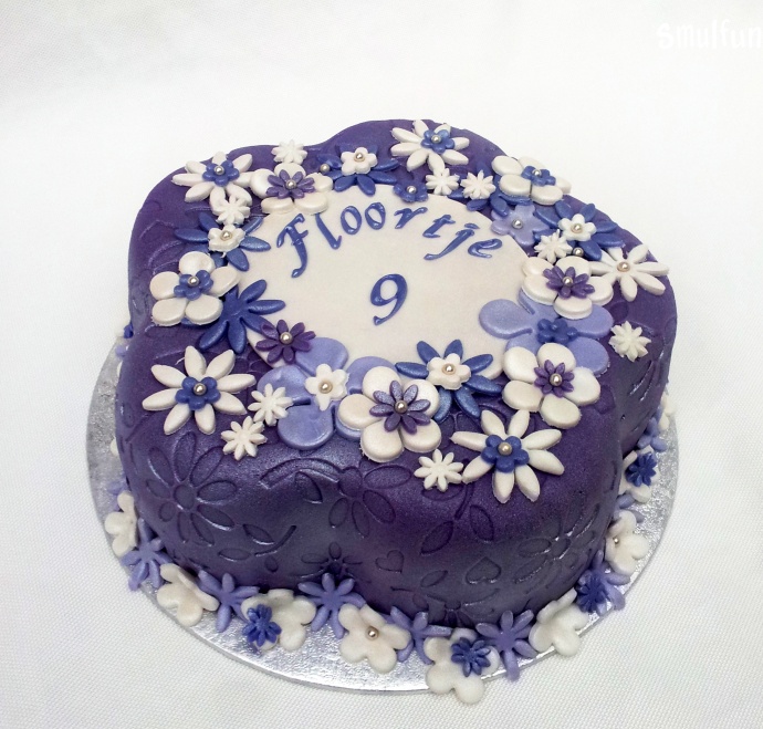 Leuke taart in een bloemvorm. De cake is in een speciale bloemvormig bakblik gebakken, gevuld met lekkere aardbeienbotercrème en bekleed met een mooie paarse marsepein laag met een leuk bloemtjes motief / patroon erin. Met de speciale glanspray krijgt deze feestelijke taart een echte finishing touch!