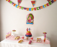 Leuke zoetetafel met verschillende lekkere zoetigheden. De trend van zoetetafel is uit Amerika over komen waaien; de zogenaamde sweettables. Op deze Mega mindy zoetetafel zitten lekkere zoete hapjes als roze koeken, cupcakes, cakepops, whoopies, limonade en een heerlijke stapeltaart als pronkstuk van de tafel. De tafel is helemaal in stijl aangekleed en versierd met slingertjes. Een echte feesttafel voor een leuke knalfuif.